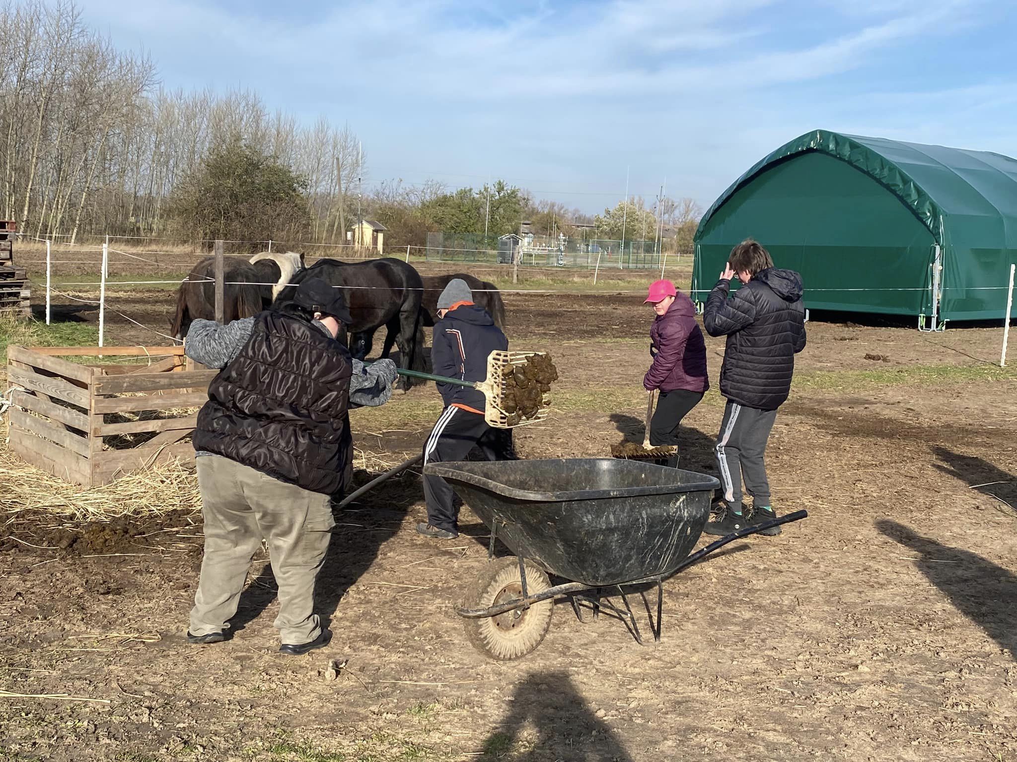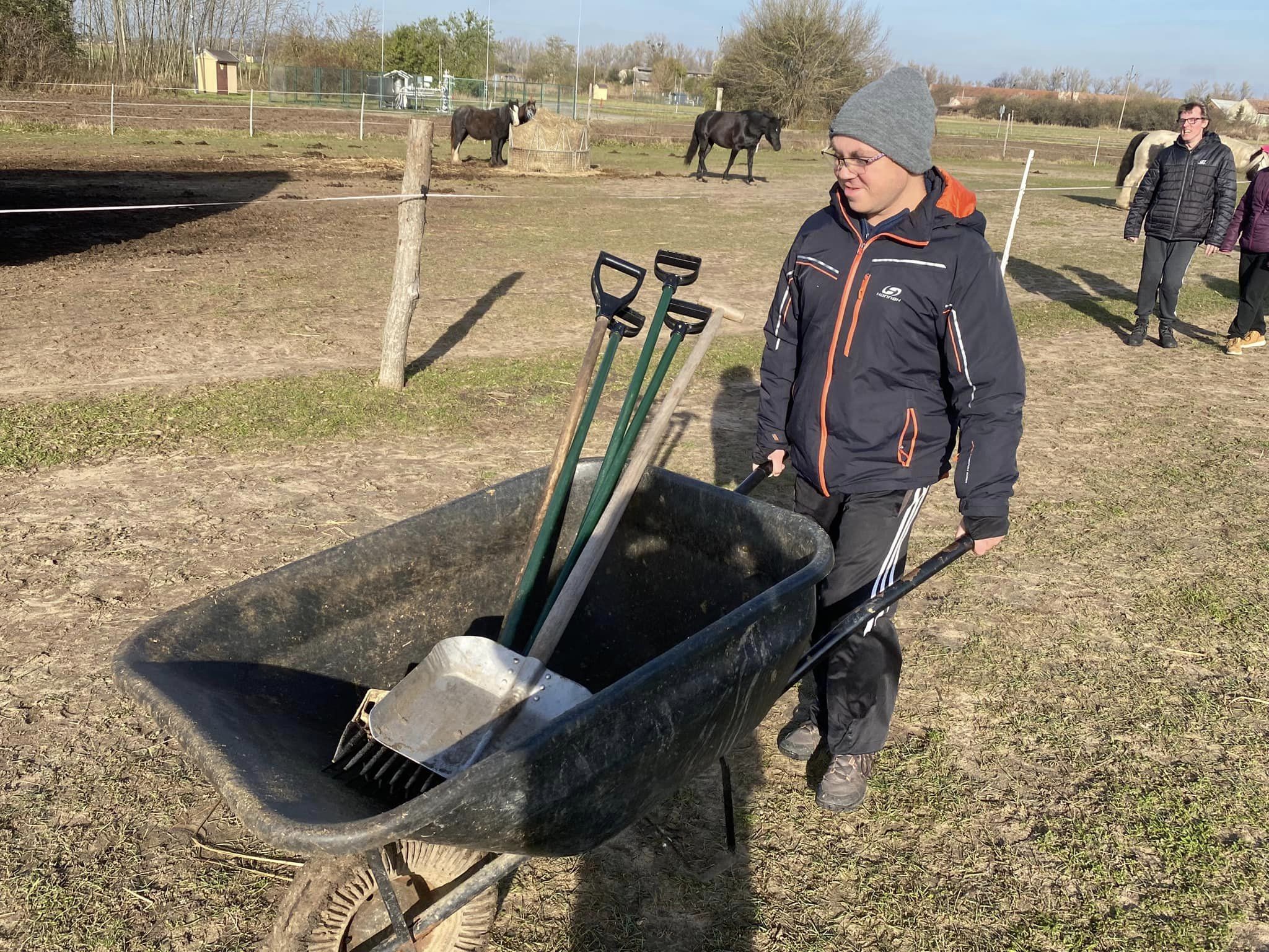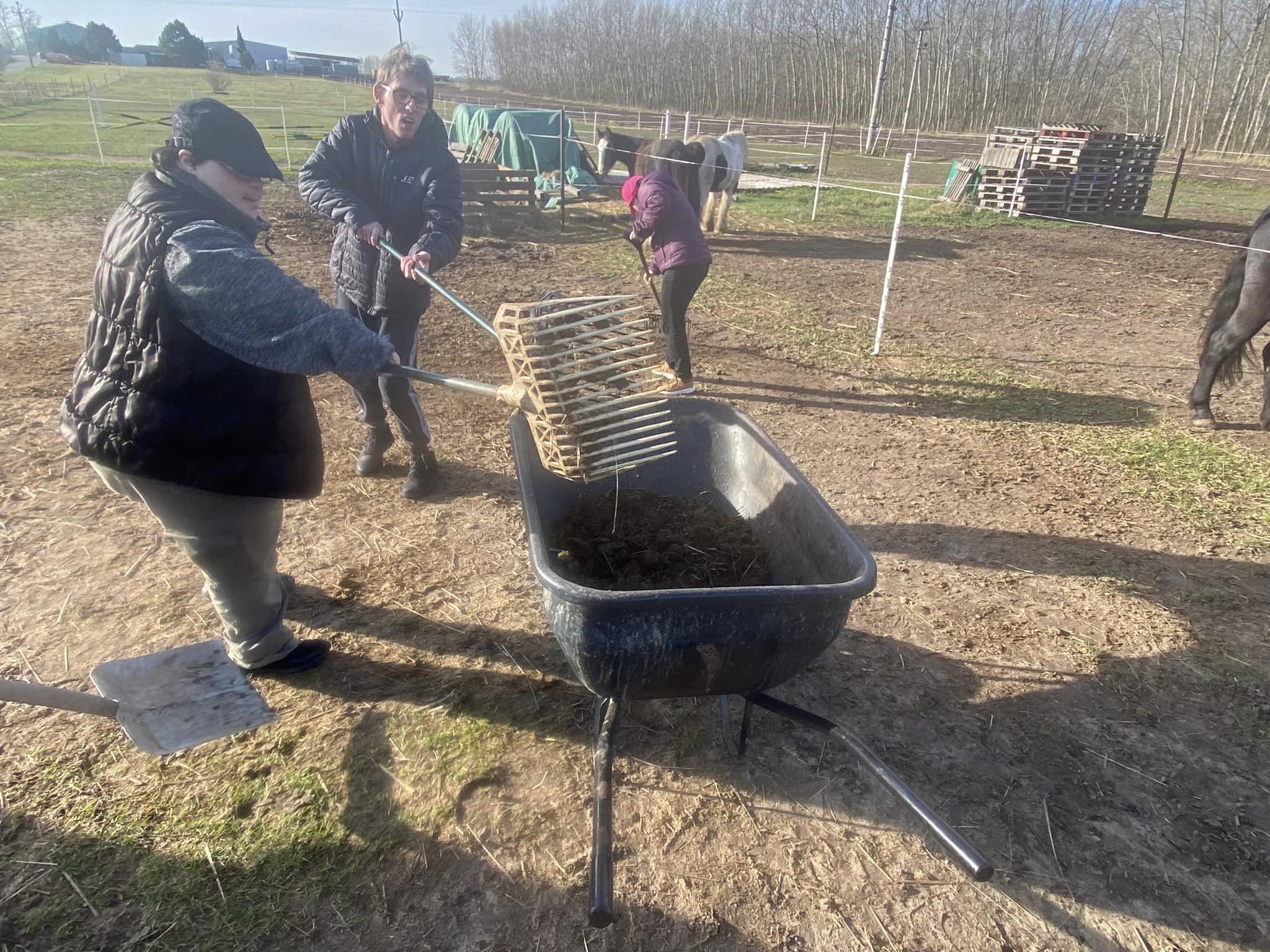 Tentokrát jsme si ale mazlení s koníky a jízdu v sedle museli nejprve odpracovat, a tak jsme uklízeli výběh kydáním hnoje. Ani jsme netušili, jak zábavná a voňavá prácička to je…