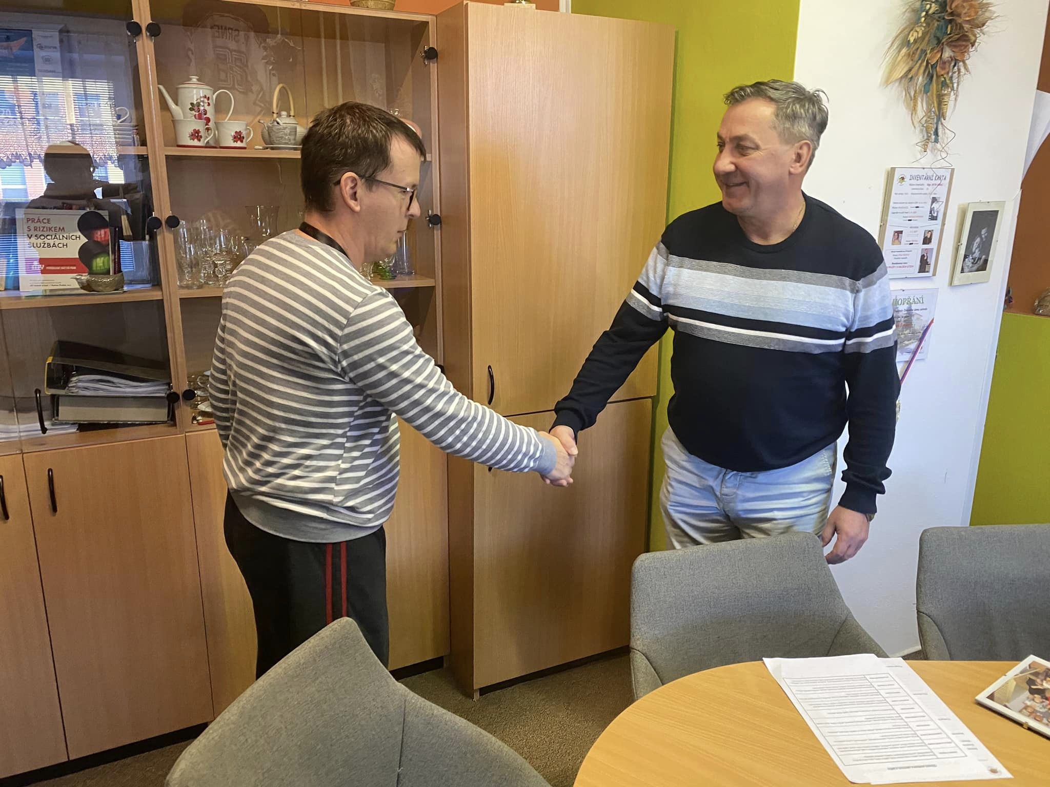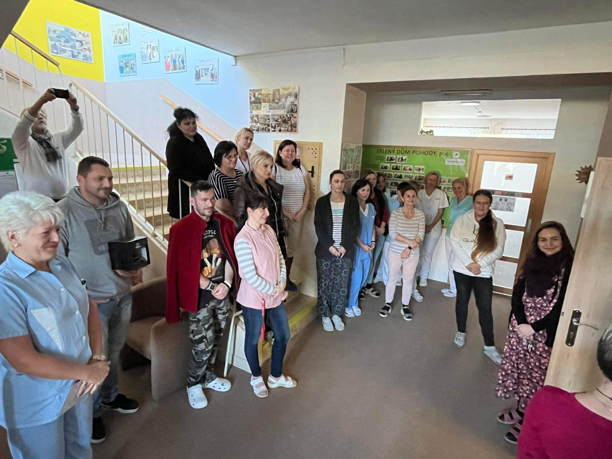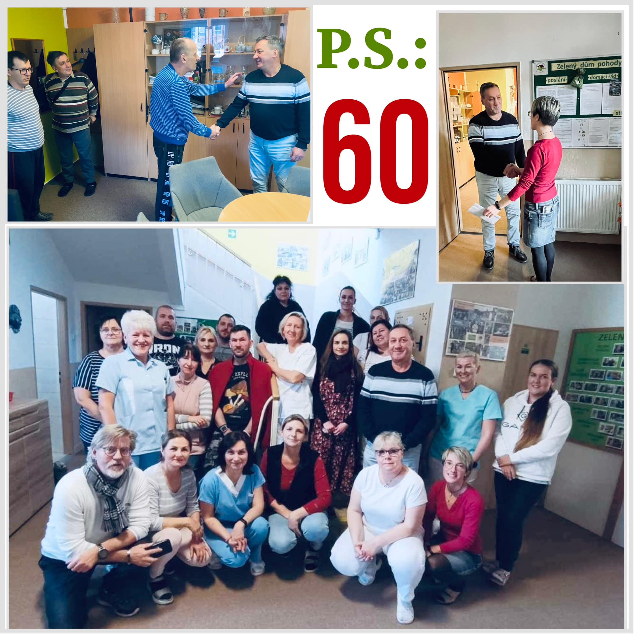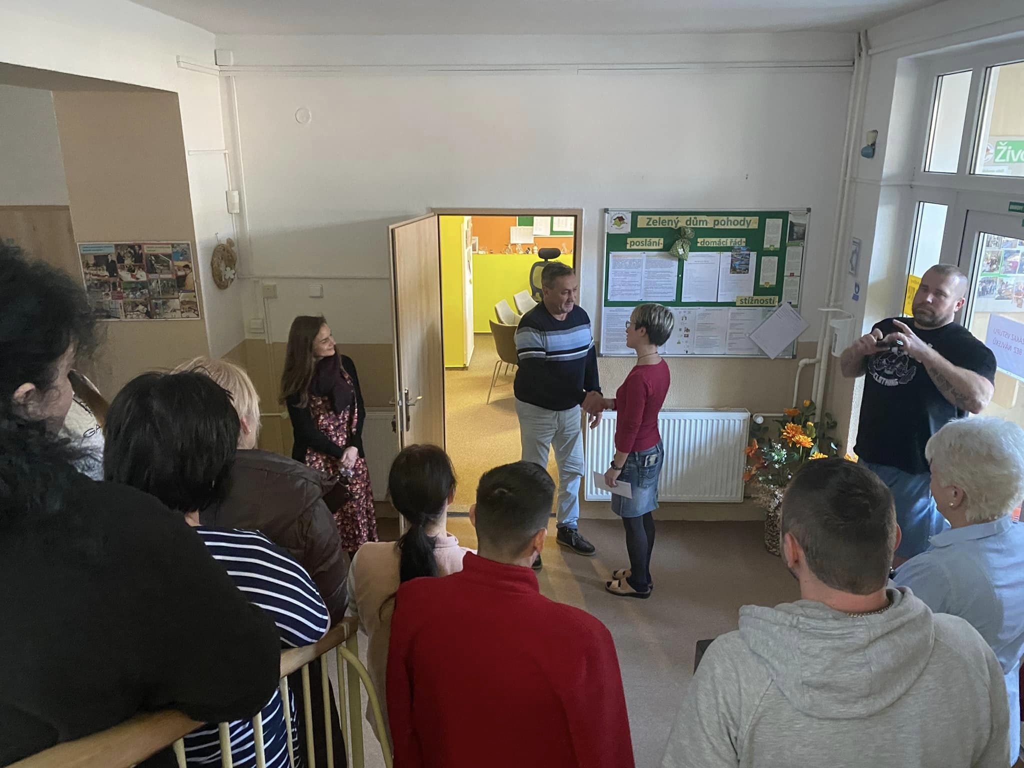 Dnes bylo na vyhlášeném koberečku před ředitelnou Zeleného domu pohody pořádně husto! Ale nemusíte se obávat - nikdo z uživatelů neutrpěl újmu a žádný z pracovníků nebyl povolán k vysvětlení situace. Ba naopak - doslova hrnoucí se davy, nejprve klientů bezprostředně po obědě, kde si vychutnali lahodný chlebíček se zákuskem, a posléze i pracovníků s hromadnou gratulací.