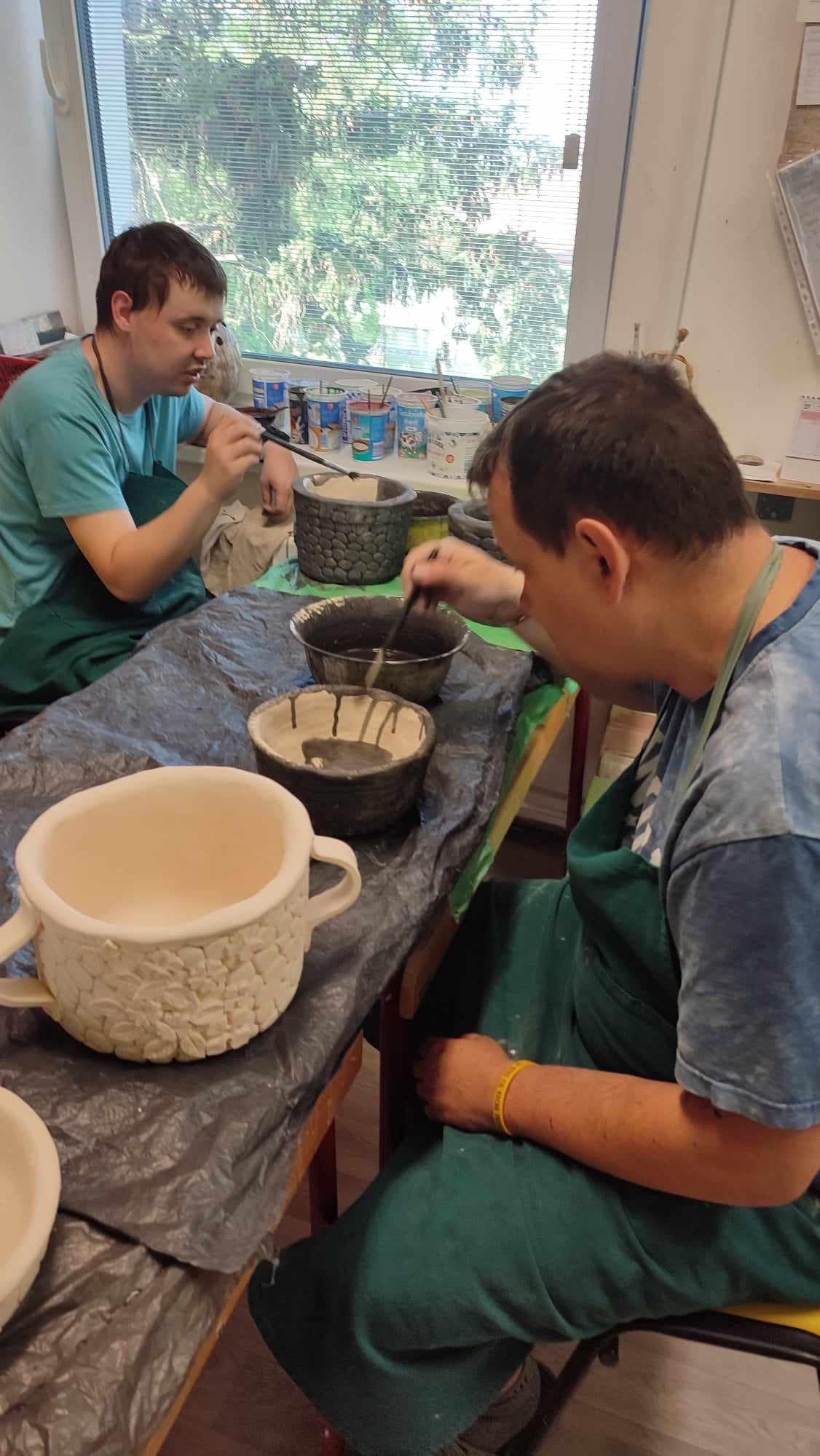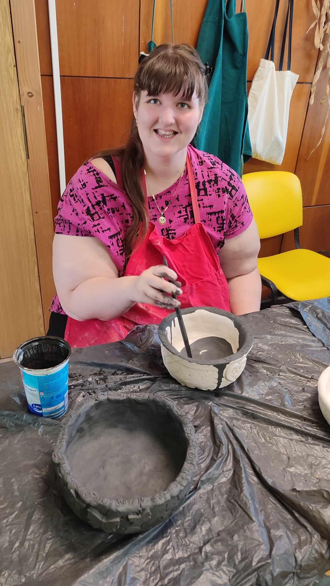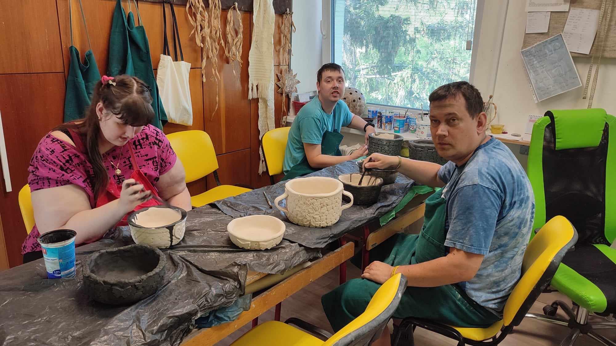 Měli jsme to štěstí, že sídlíme v budově Integrované střední školy, kde jsou i velmi šikovní studenti, kteří nám po nabídce pana vedoucího odborného výcviku Pavla Vrány ochotně vyrobili pletací rám, za což jsme nesmírně vděční. Takže kdo si troufá zkouší tkát, a kdo ne tak zůstává keramiky, pletení košíků či šití, anebo počítá jednoduché matematické příklady.