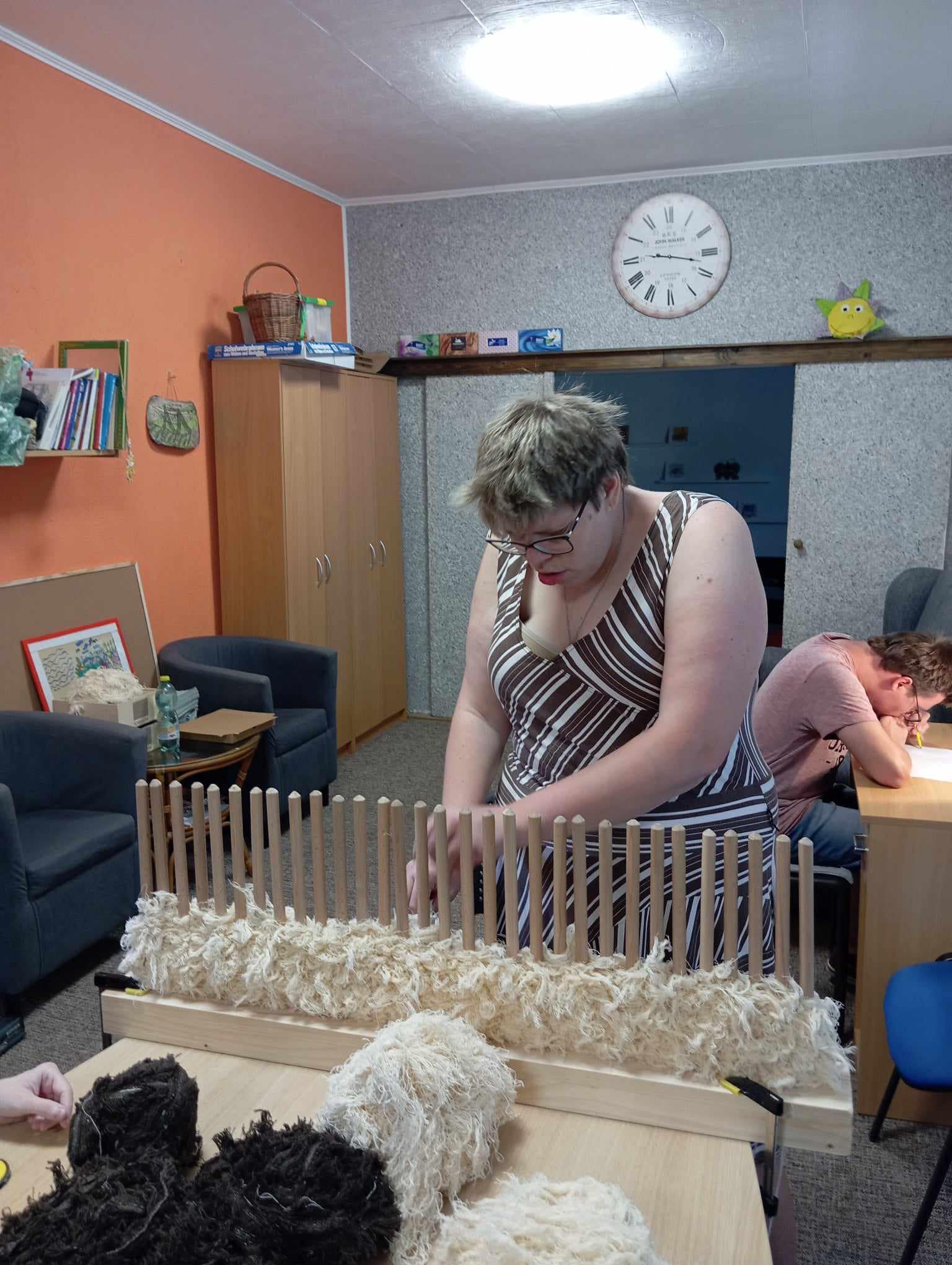Je to přesně týden, co se první odvážlivci ze služby Denní stacionář začali seznamovat se zbrusu novou aktivizační činností. Tkaní textilních látek, spočívající v opakovaném provazování látkových vláken, je u lidí s hendikepem celkem běžné, a tak jsme si řekli když to jde jinde, proč by to nemělo jít i u nás.